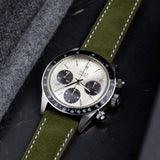 We selected Taurillon Nubuck for our nubuck straps, the very best part of a leather hide also used in high-end luxury purses and handbags. It has a luxurious feel and is of course finished to our highest standards, with light-crème stitching with ease-of-use quick-release spring bars. Available in multiple colors, we’re sure there we have the perfect match for you.